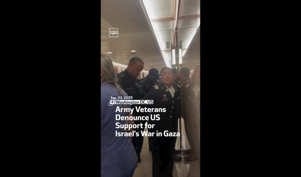 US Army veterans Anthony Aguilar and Josephine Guilbeau interrupt a Senate hearing to denounce Washington’s support for … source