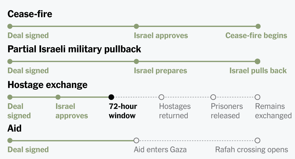 Cease-fire Deal signed Israel approves Cease-fire begins Partial Israeli military pullback Deal signed Israel prepares Israel pulls back Hostage exchange Deal signed Israel approves 72-hour window begins Hostages returned Prisoners