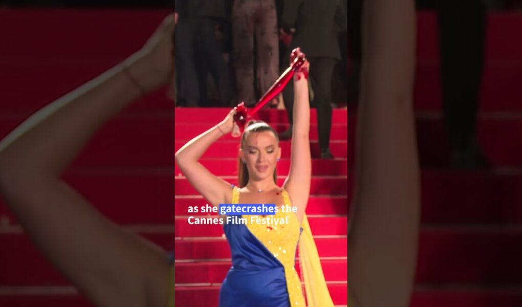 A woman dressed in Ukrainian colours pours red liquid on herself on the steps of the Palais des Festivals during a screening of … source