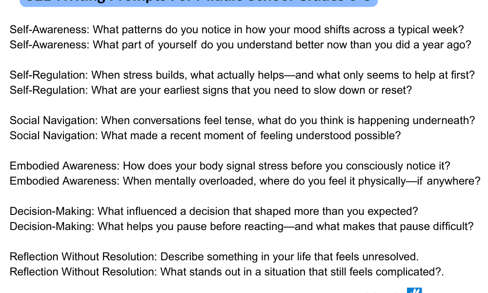 20 SEL Writing Prompts For Middle School Grades 6-8