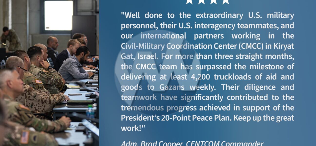 Commander of U.S. Central Command, Adm. Brad Cooper, praised U.S., interagency, and international teams for delivering thousands of truckloads of humanitarian aid to Gaza each week and for their role.