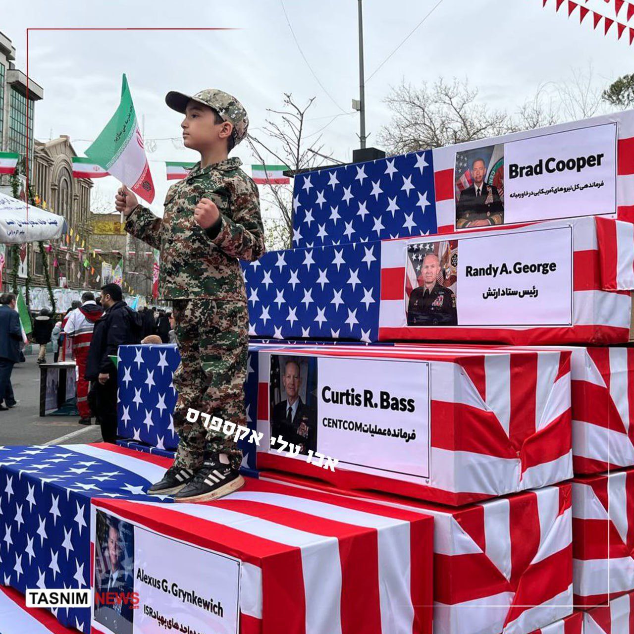 In one scene, a child dressed in a regime military uniform was filmed standing on top of the coffins, highlighting the intensely choreographed displays of hostility promoted during the events.