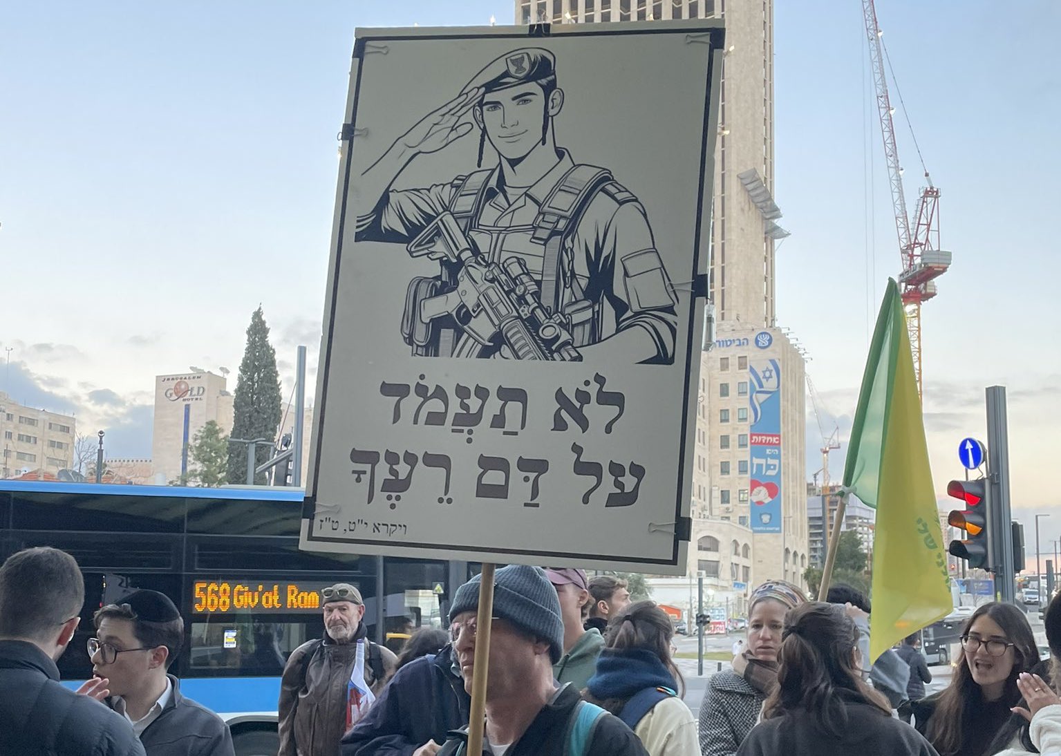 “Someone who doesn’t learn Torah needs to enlist,” agreed Ido Kan, 61. Kan, who had served during both intifadas, carried a banner proclaiming, “Do not stand by your brother’s blood,” a phrase from a verse in Leviticus 19:16 that forbids inaction in the face of someone else facing immediate risk to their life.