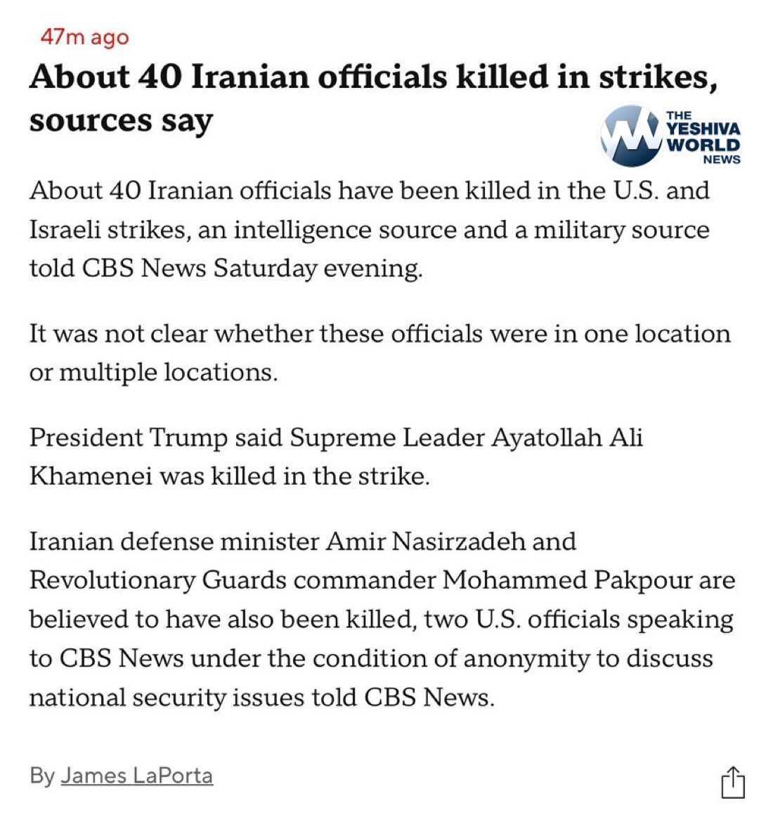 🚨 MORE GOOD NEWS: An intelligence source and a military official told CBS News Saturday evening that roughly 40 Iranian officials have been killed in U.S. and Israeli strikes.