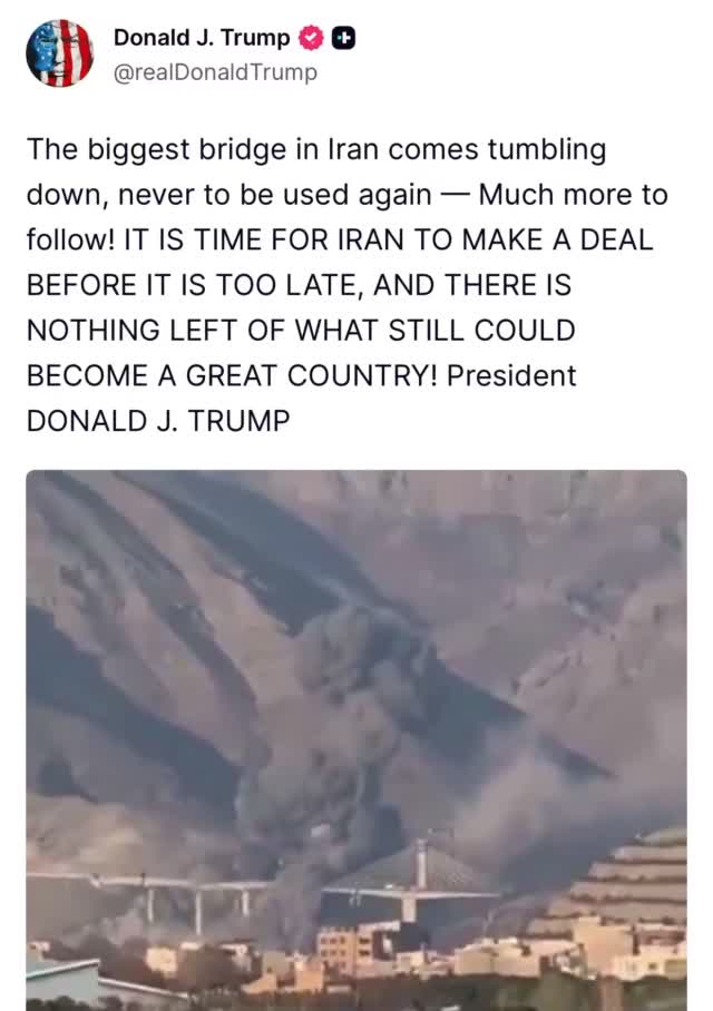 President Trump confirmed in a new statement on Truth Social that U.S. forces carried out a strike on Iran’s B-1 bridge in Karaj today, warning that further attacks on Iranian infrastructure could follow.