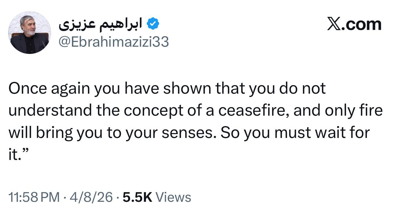 Head of Iran’s National Security Commission just now: “Once again, you’ve shown you don’t understand the concept of a ceasefire, only fire will bring you to your senses, so you should be ready for it.”